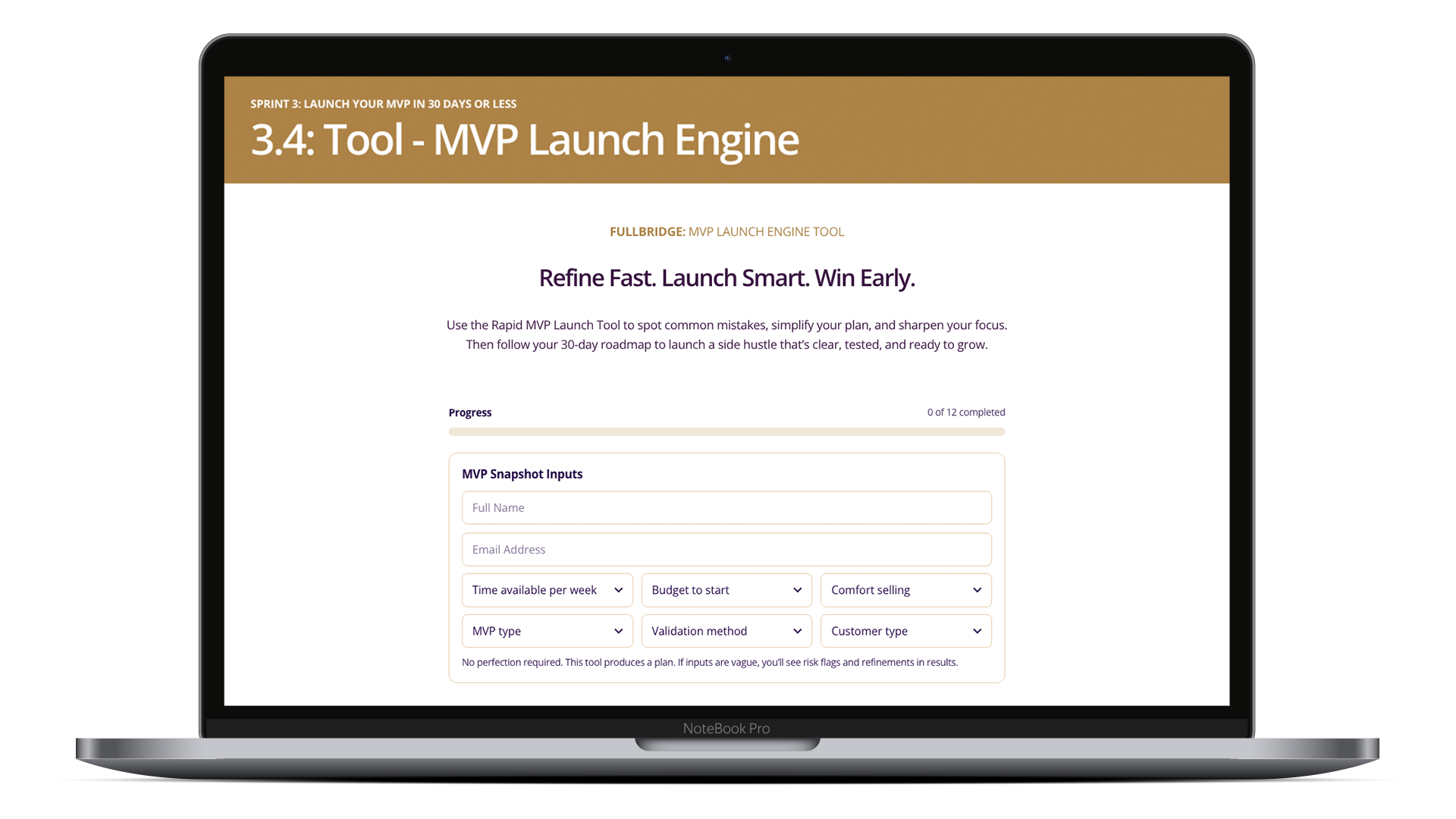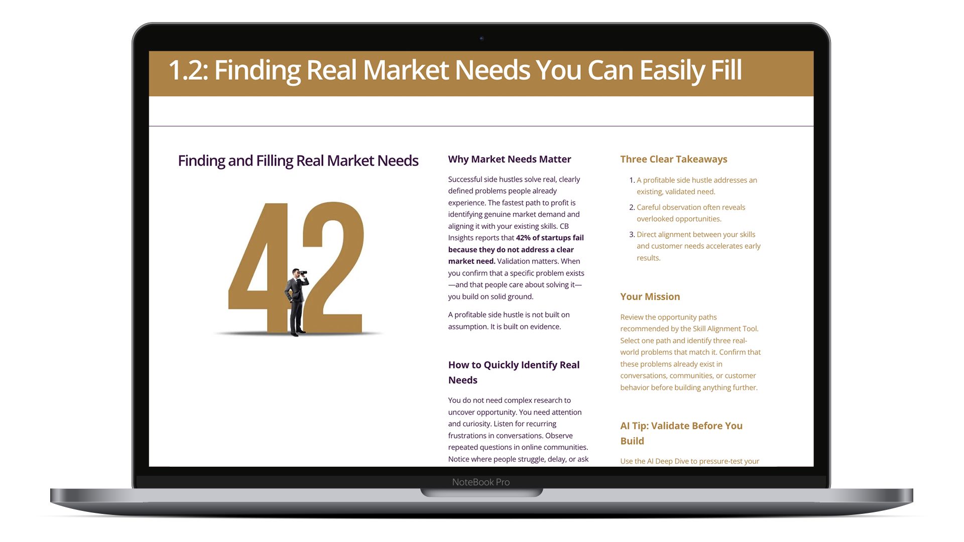 Six focused learning sprints take you from idea to income: you identify the right opportunity, validate demand, build a simple MVP, set pricing based on real market signals, launch effectively, and generate your first revenue.
